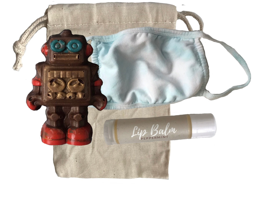 In this Smile reusable bag you will receive; a hand painted Cylie chocolate robot, a tie dye MamaDye reusable mask, a Twenty20 Skin Care lip balm and a special message from a student in our class. Enjoy!